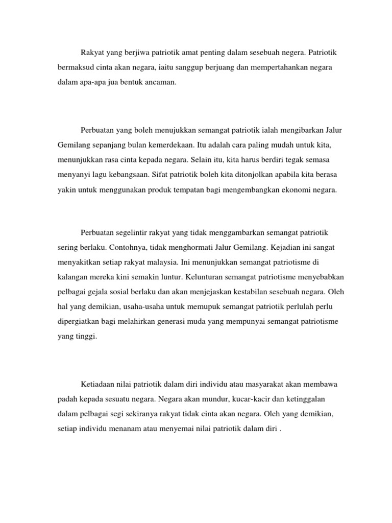 Semangat patriotik merujuk kepada sifat patriot yakni semangat cinta akan tanah air. Up to 24 cash back Contoh Karangan A SPM DAN PT3. Usaha meningkatkan semangat patriotik.